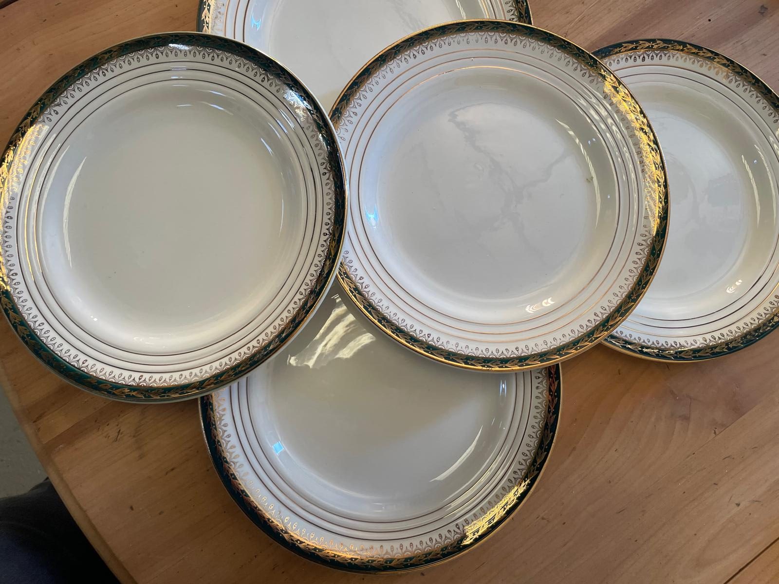 Ces grandes assiettes plates à motifs vert foncé avec détails dorés sont parfaites pour composer une table de réception élégante et pleine de caractère. Issues de vaisselle ancienne, elles mêlent différents motifs élégants et raffiné qui rappellent les tables de famille et les services de porcelaine d’époque.