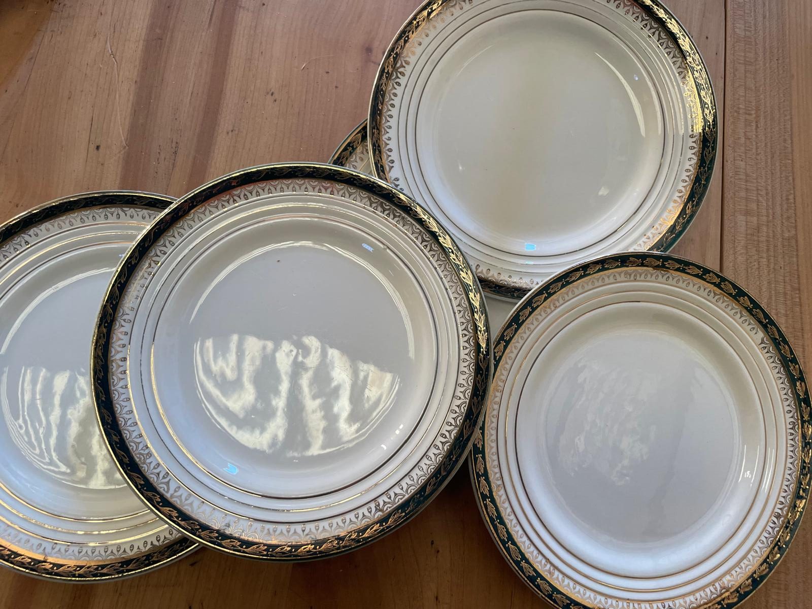 Ces assiettes dessert à motifs verts foncés avec décor doré apportent une note délicate et intemporelle à votre table. Issues de vaisselle ancienne dépareillée, elles mêlent différents décors dorés et scènes traditionnelles qui créent une décoration chic.